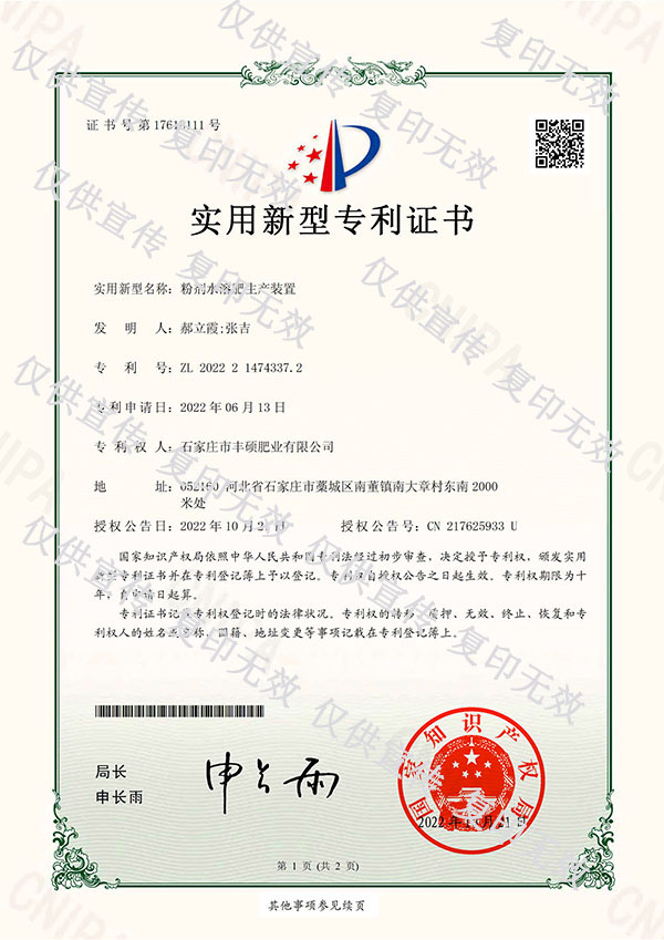 粉劑水溶肥生產裝置專利證書 一種復合肥原料粉碎裝置實用新型專利證書